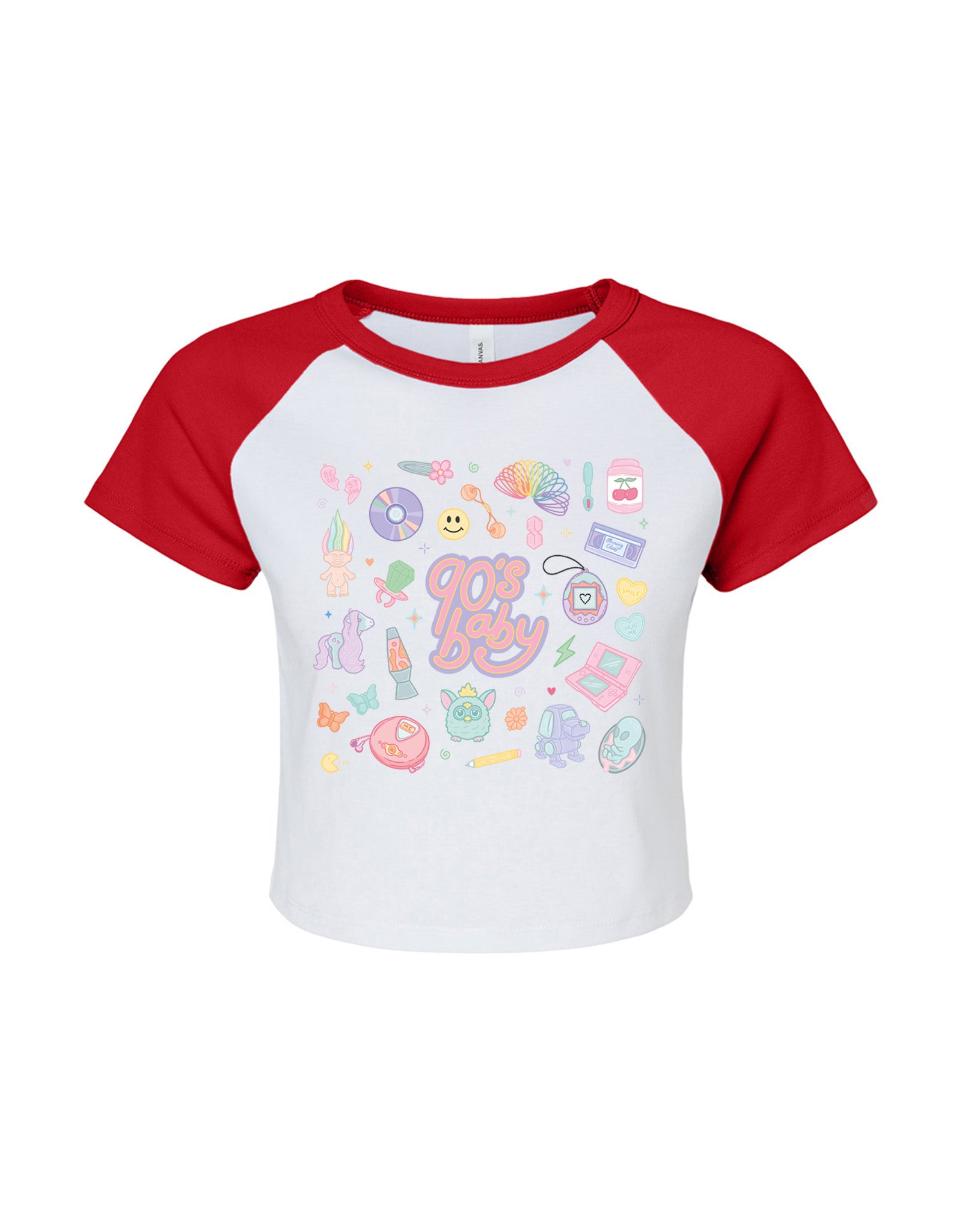 The 90s Baby short sleeve baby tee is a fitted throwback classic. Made from soft, stretchy organic cotton rib, it features our colourful 90s inspired print. The flattering fitted silhouette gives it true retro energy. Lightweight and comfortable for everyday wear. A fun nod to 90s style with a modern fit.