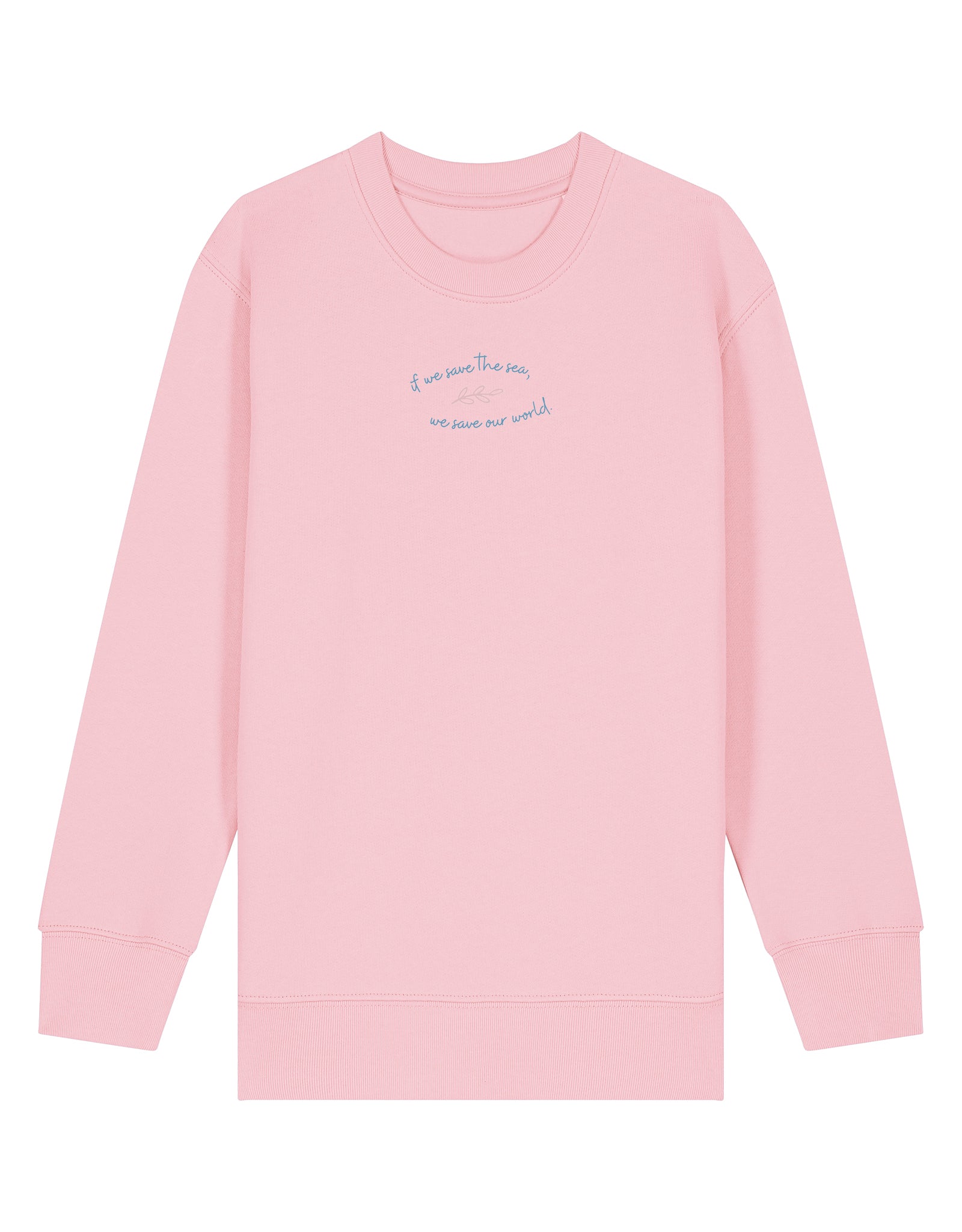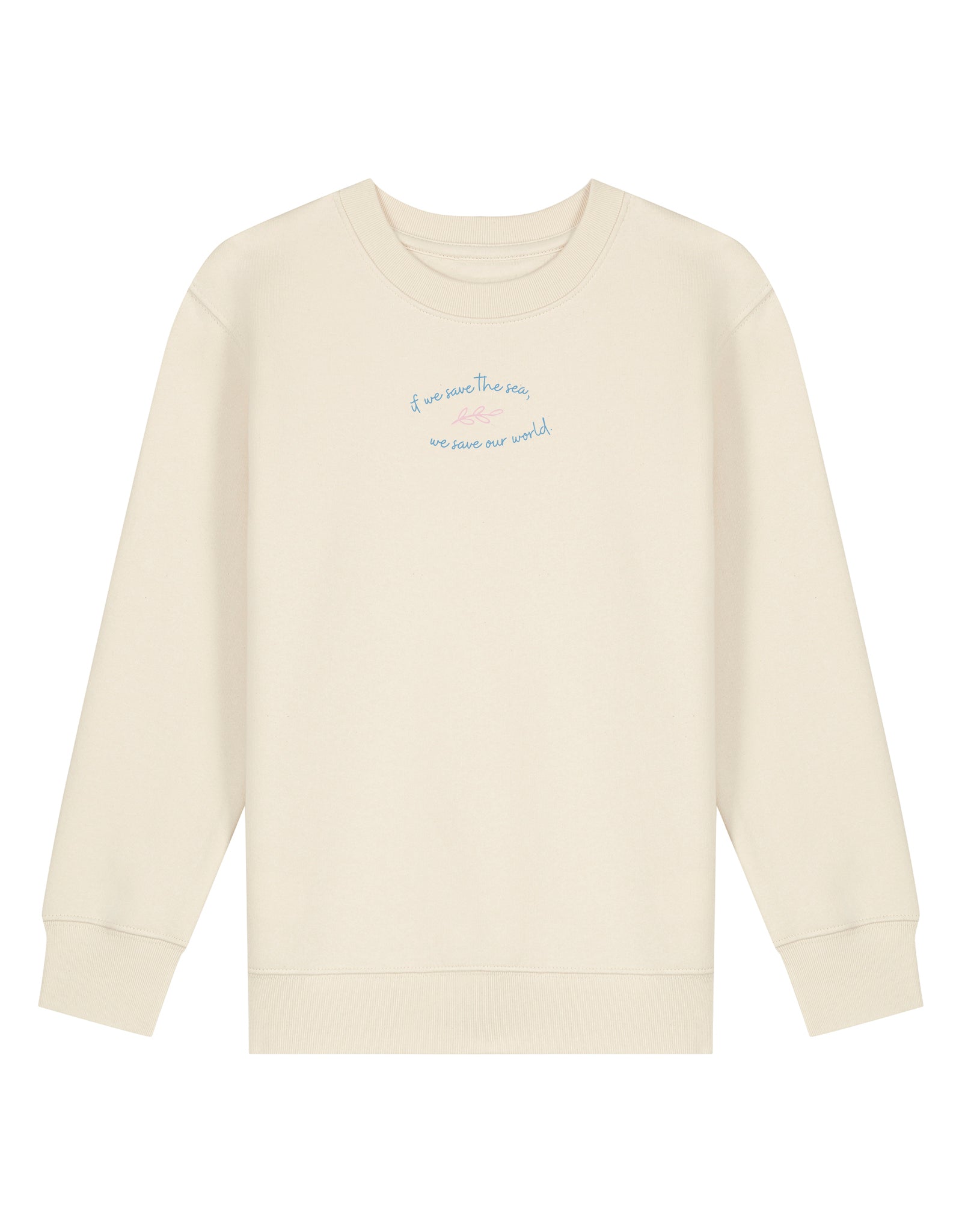 Shop our children’s organic cotton sweatshirt with Save The Sea back print. Soft sustainable kids jumper with whale design. Ocean conservation inspired children’s clothing.
