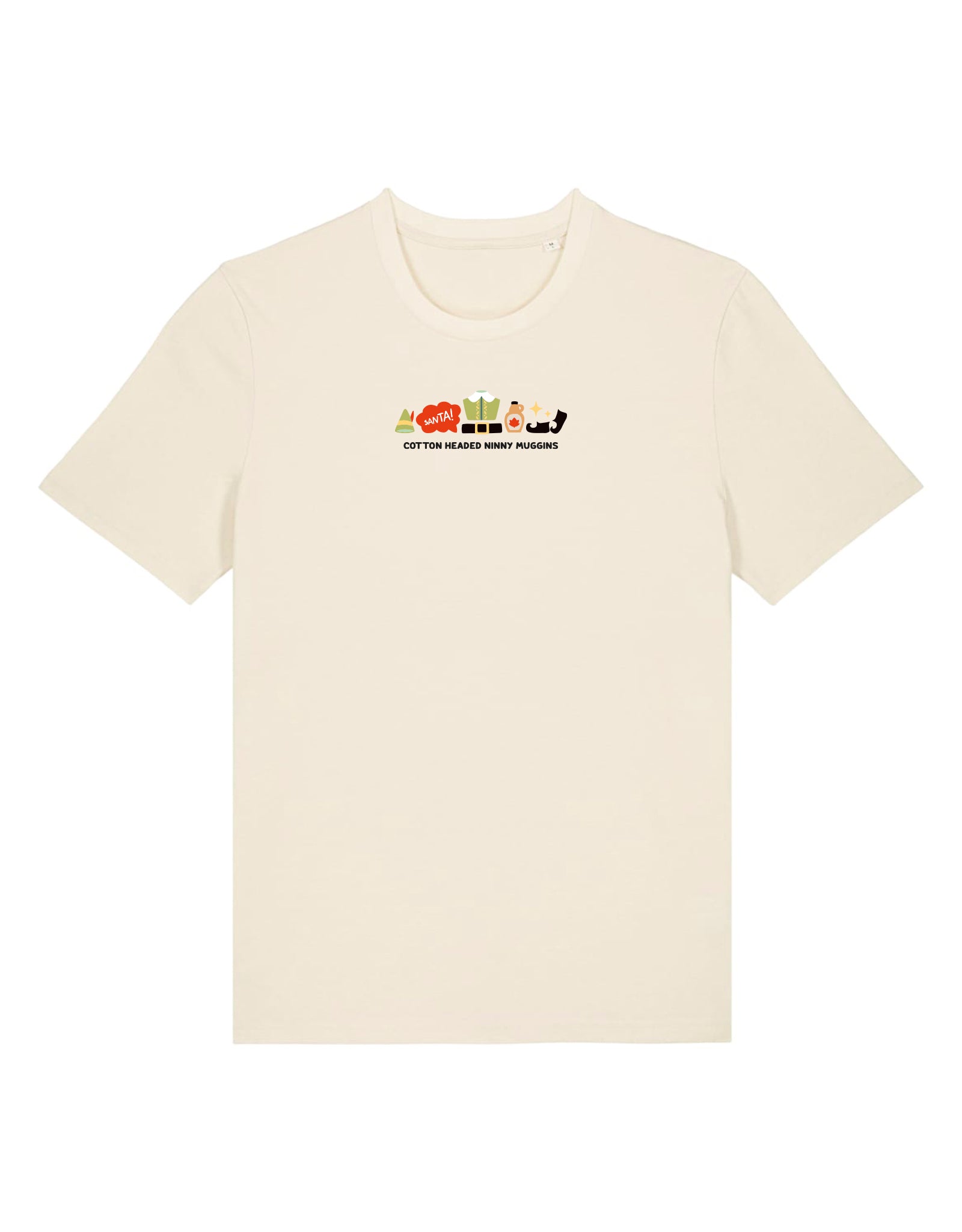 Elf inspired Christmas t-shirt with embroidered cotton headed ninny muggins quote. Organic cotton comfort with playful festive style. The ultimate gift for Elf movie fans.