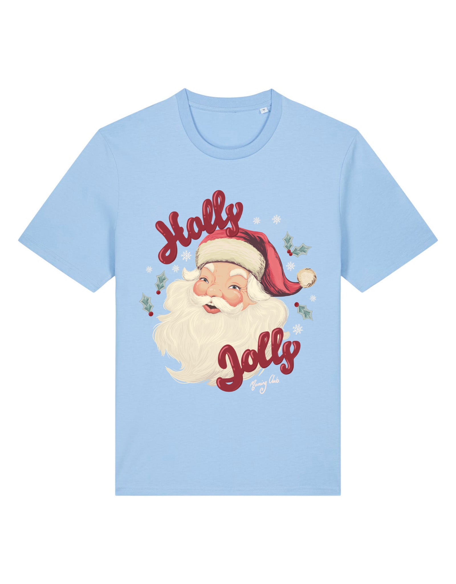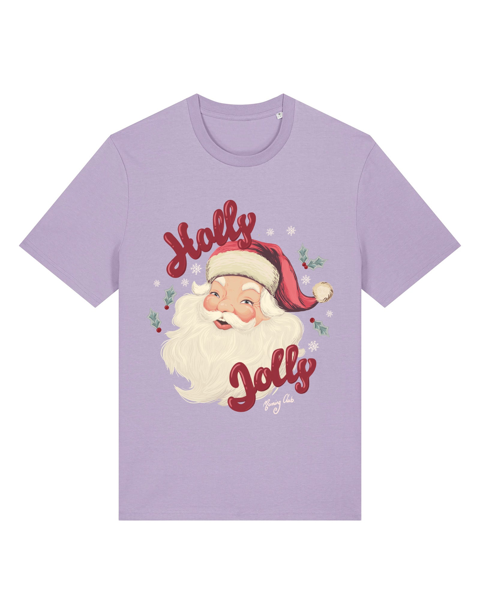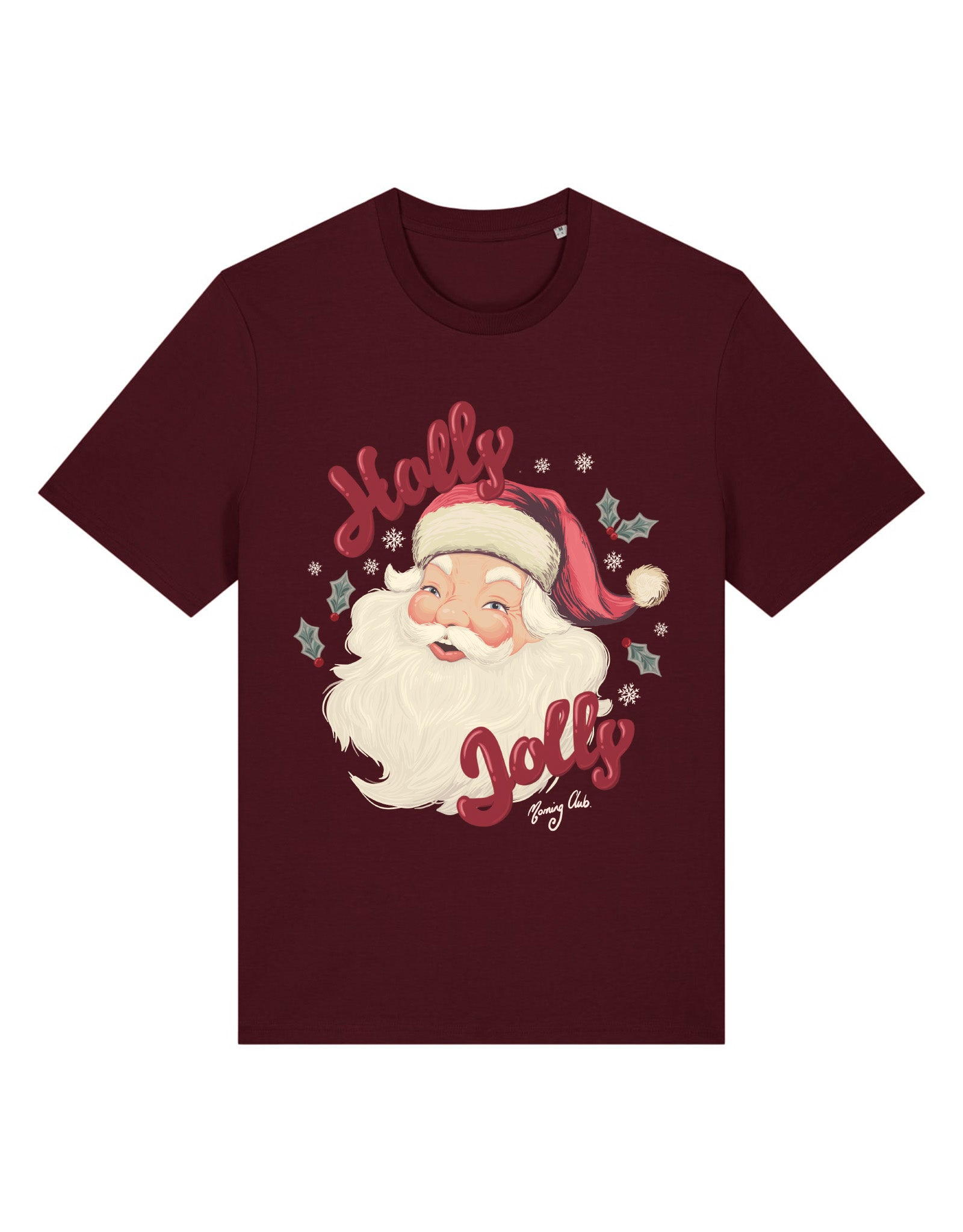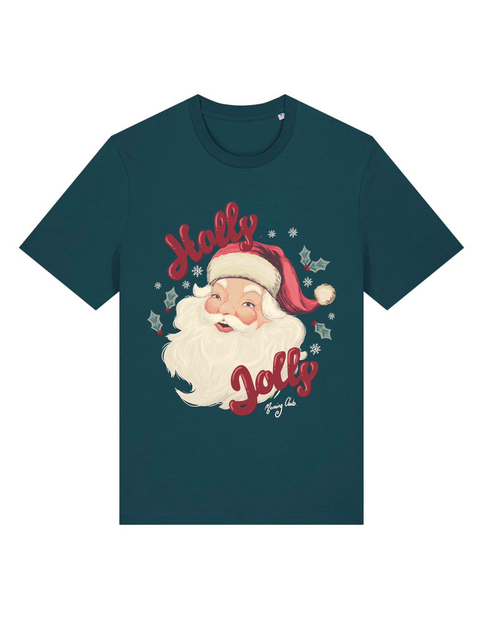Santa face Christmas t-shirt for festive fun. Soft organic cotton with bold Holly Jolly print. The perfect cheerful Christmas outfit or gift.