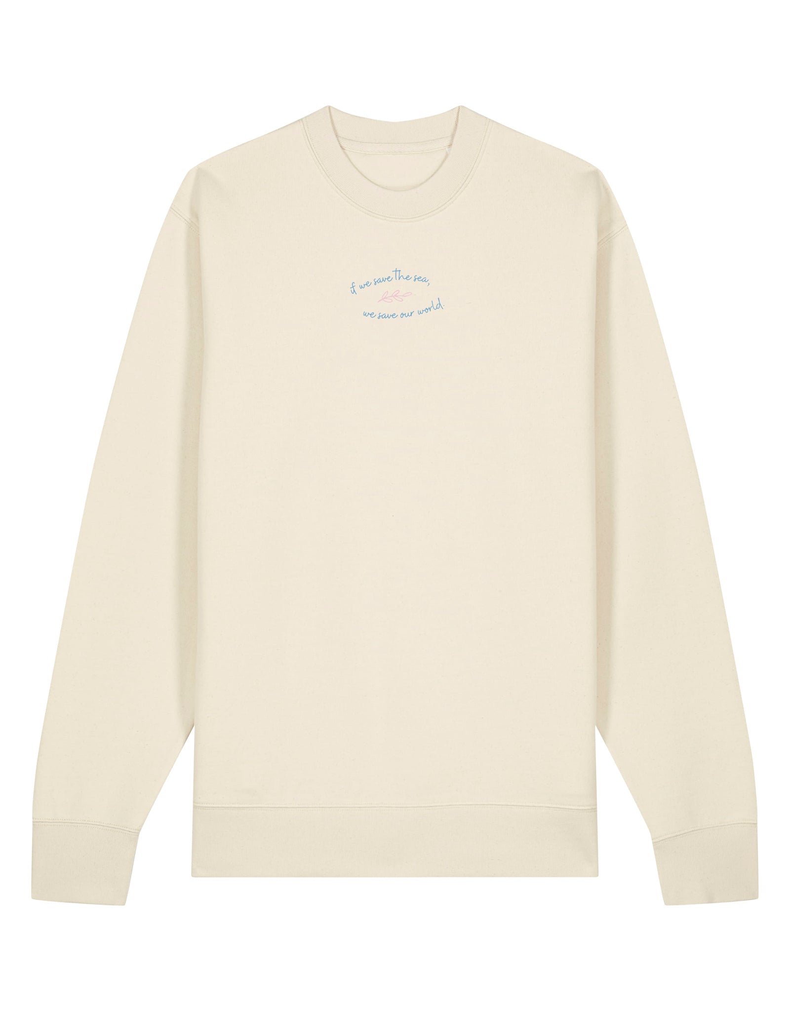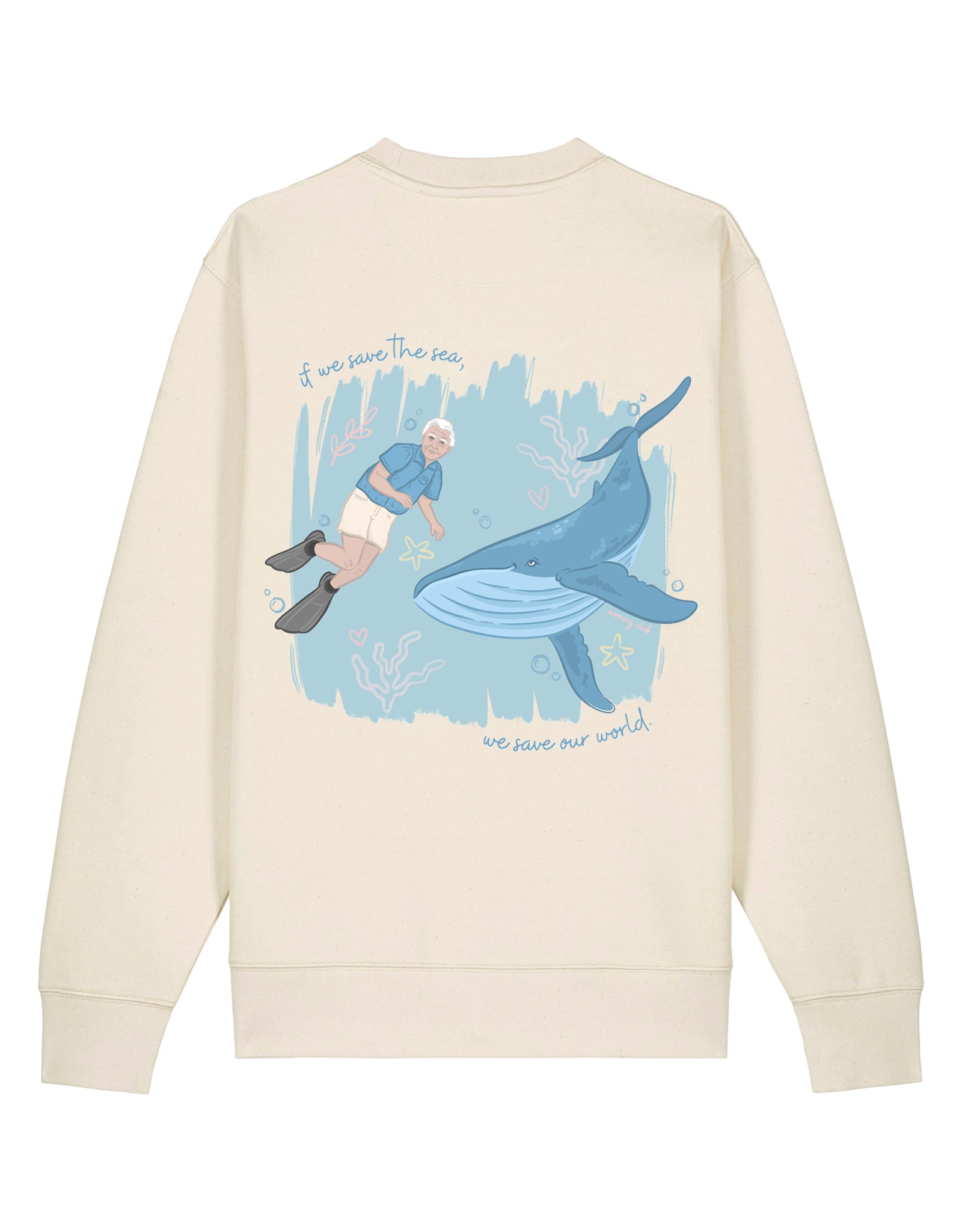 Organic cotton sweatshirt with Save The Sea back print and minimal front graphic. Relaxed unisex sustainable jumper with whale design. Ocean conservation inspired sweatshirt.