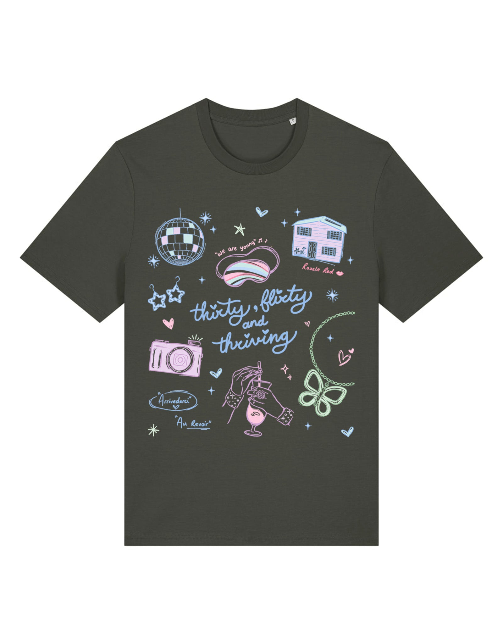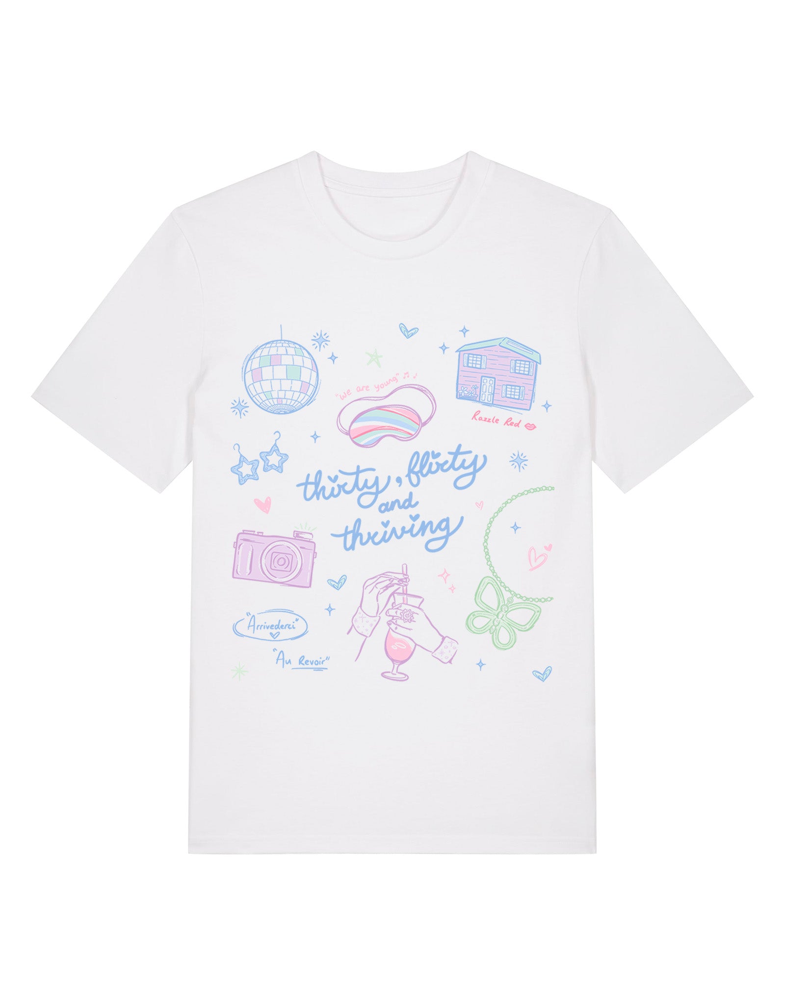 The Thirty, Flirty & Thriving unisex organic cotton t-shirt by Morning Club is inspired by 13 Going on 30. Featuring a nostalgic illustrated print and a comfortable, relaxed fit, it’s perfect for everyday wear. A must have graphic tee for fans of feel good films and playful style.