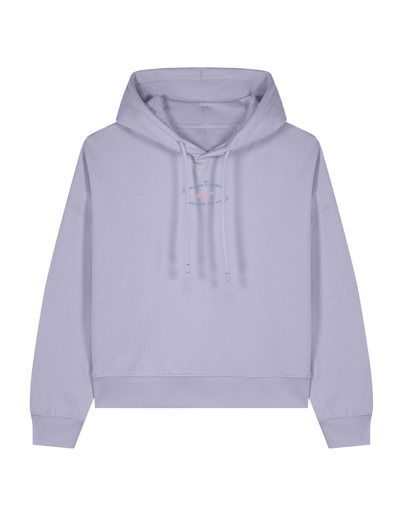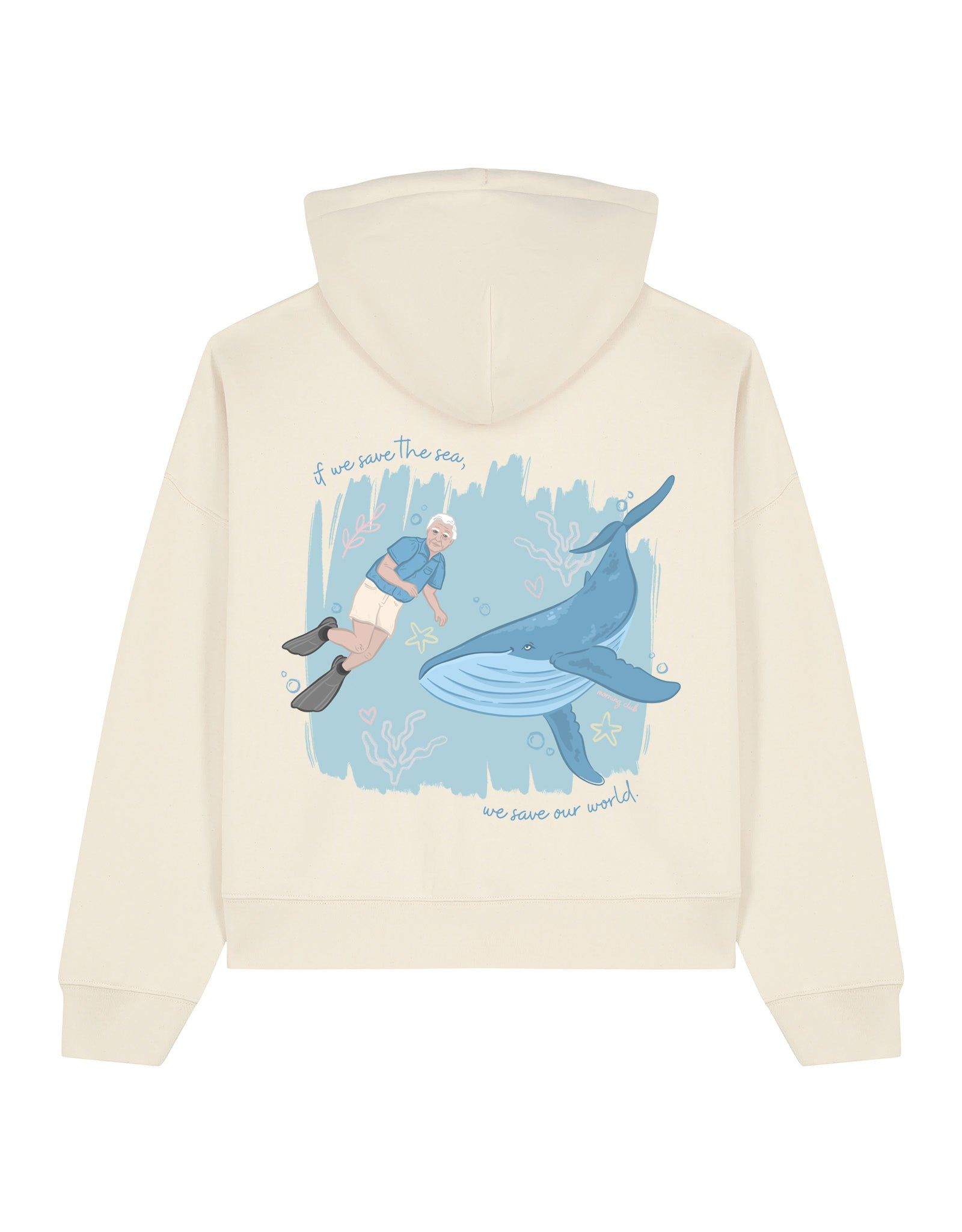 Women’s boxy organic cotton hoodie with Save The Sea back print and front detail. Relaxed sustainable hoodie with whale design. Ocean inspired ethical loungewear.